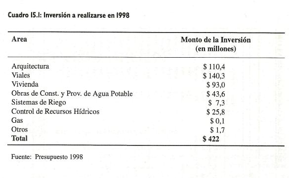 Durante 1998, el gobierno provincial tiene previsto realizar inversiones por un monto de US$ 422 millones. Como se observa en el cuadro 15.1, el rubro de mayor magnitud serán las construcciones viales, seguido por las obras de arquitectura, y la construcción de viviendas. Dentro de las obras de arquitectura se destacan la construcción de establecimientos penitenciarios, la provisión de locales para enseñanza media y la remodelación, reparación y mantenimiento de edificios. En materia de vivienda, la inversión se destinará a la construcción de conjuntos habitacionales, sumando un total de $ 92 millones mientras que en inversiones viales se incluirá básicamente la construcción, ampliación, y mantenimiento de la red pavimentada y la ejecución de nuevos pavimentos por un valor de US$ 22,5 millones y US$ 27,2 millones respectivamente. Tal como fue explicado en el capítulo 11, la actual administración realizó una significativa reorientación del gasto público favoreciendo las inversiones.